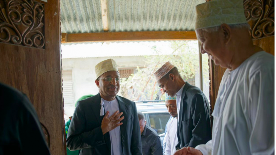 Waziri Haroun Ali Suleiman akamribisha Alhaj Dk. Hussein Ali Mwinyi Kusali na Waumini